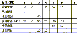 表1 產(chǎn)品A的需求量計(jì)算(產(chǎn)品A,提前期=2,批量=10)