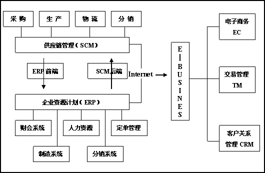為了使企業(yè)的業(yè)務(wù)處理流程更加連貫,增強(qiáng)企業(yè)對市場的響應(yīng)能力和市場競爭力,必須將ERP與EC有機(jī)地結(jié)合在一起,組成一個(gè)集成的企業(yè)信息系統(tǒng)。在這個(gè)集成的系統(tǒng)中,企業(yè)的各種實(shí)時(shí)信息可以得到及時(shí)的處理。到目前為止,企業(yè)中的各種系統(tǒng)如EC、ERP、SCM和CRM等的關(guān)系還不是很清楚,如何成功地把這些系統(tǒng)有效的集成在一起并高效率的運(yùn)行是目前急需解決的突出問題。而想有效地將不同的系統(tǒng)集成在一起,首先要確定集成系統(tǒng)的核心組成部分及其結(jié)構(gòu)。在電子商務(wù)環(huán)境下,ERP、SCM和CRM是企業(yè)信息系統(tǒng)的重要組成部分。其中SCM與ERP的主要區(qū)別在于它只對供應(yīng)鏈上的有關(guān)信息進(jìn)行管理,而很少涉及企業(yè)內(nèi)部的經(jīng)營活動(dòng)?蛻絷P(guān)系管理(Customer Relationship Management, CRM)是以客戶需求為中心來組織推動(dòng)整個(gè)企業(yè)的經(jīng)營,其主要功能是記錄客戶與企業(yè)的交往和交易,并將有可能改變客戶購買行為的信息加以整理和分析,同時(shí)進(jìn)行商業(yè)情報(bào)分析,了解競爭對手、市場和行業(yè)動(dòng)態(tài)[5]。
