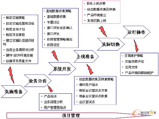 信息化項(xiàng)目一般可以分為選型招標(biāo)、項(xiàng)目實(shí)施、運(yùn)行維護(hù)三大階段,其中項(xiàng)目實(shí)施大致分為實(shí)施準(zhǔn)備、業(yè)務(wù)分析、系統(tǒng)開(kāi)發(fā)、上線準(zhǔn)備、實(shí)際切換、運(yùn)行操作六個(gè)步驟。見(jiàn)下圖。