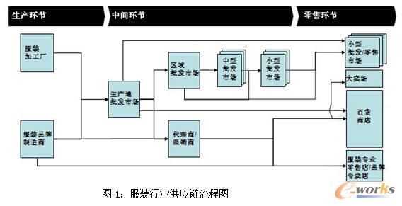 下面,以中國(guó)的服裝行業(yè)來探討服裝體系的供應(yīng)鏈。首先整個(gè)供應(yīng)鏈?zhǔn)莻鹘y(tǒng)批發(fā)市場(chǎng),精準(zhǔn)投放的市場(chǎng)還是一片空白。單一企業(yè)供應(yīng)鏈的運(yùn)作流程包括從采購(gòu)、倉(cāng)儲(chǔ)、庫(kù)存管理、運(yùn)輸?shù)筋櫩头⻊?wù)等環(huán)節(jié)的管理。如果把這個(gè)體系再進(jìn)行一次分步,流程可以延伸到每個(gè)供應(yīng)商,然后依次到運(yùn)輸、組裝、分配、零售商、客戶。它們都包含了生產(chǎn)、包裝、倉(cāng)儲(chǔ)、挑揀、接受、倉(cāng)儲(chǔ)、挑揀、運(yùn)輸、接收、倉(cāng)儲(chǔ)、挑揀再運(yùn)輸?shù)鹊攘鞒。在整個(gè)過程中會(huì)產(chǎn)生大量的離散數(shù)據(jù),但是這些數(shù)據(jù)中有很多是能夠貫穿始終的。我們想對(duì)供應(yīng)鏈極做大規(guī)模的提升,就需要對(duì)這些數(shù)據(jù)進(jìn)行加工、管理或處理。如圖1所示。