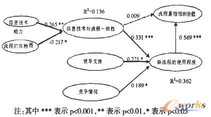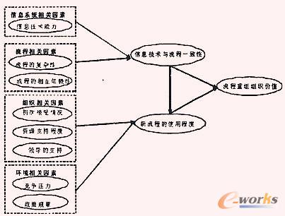 1 引言 業(yè)務(wù)流程重組(BPR,Business Process Reengineering)是20世紀(jì)90年代初由Hammer和Champer提出的全新的管理思想。當(dāng)時世界上著名企業(yè)如IBM、科達(dá)、通用汽車等紛紛進(jìn)行業(yè)務(wù)流程重組并獲得了巨大的收益。然而,BPR一直是成功與失敗相伴隨的,根據(jù)2001年英國FCD調(diào)查機(jī)構(gòu)對全球600多個BPR項(xiàng)目的調(diào)查結(jié)果顯示,有45%的企業(yè)在BPR后產(chǎn)生了副作用,30%的企業(yè)在實(shí)施BPR后無明顯效果,成功的BPR項(xiàng)目只占了25%。在國內(nèi)情況也相似,很多學(xué)者開始探討B(tài)PR失敗的原因,發(fā)現(xiàn)導(dǎo)致BPR失敗的很重要的一點(diǎn)原因就是業(yè)務(wù)流程重組會引起組織的變革,流程的變化以及技術(shù)的更新,這些變革的產(chǎn)生必然會引起對這些新變化的抗拒,最終致使新流程并不能按照預(yù)期實(shí)施,導(dǎo)致整個項(xiàng)目的失敗。BPR項(xiàng)目的成功與否,很大程度上取決于公司是如何將新的流程方案付諸實(shí)踐的,也就是企業(yè)如何進(jìn)行BPR項(xiàng)目的變化過程的。 雖然Hammer和Champy(1993)最初就充分認(rèn)識到了IT的作用,但當(dāng)時的IT技術(shù)水平對企業(yè)運(yùn)作的影響還不夠大。隨著互聯(lián)網(wǎng)的出現(xiàn),整個世界進(jìn)入了網(wǎng)絡(luò)時代,各行各業(yè)無不受到互聯(lián)網(wǎng)的強(qiáng)大沖擊,這賦予了IT以更多、更新的內(nèi)涵,IT的使能作用已經(jīng)給企業(yè)流程再造增加了一些新的可能,甚至于改變企業(yè)本身的性質(zhì)。BPR概念發(fā)展是與IT技術(shù)緊密相連的。 2 相關(guān)理論 2.1 BPR與創(chuàng)新傳播理論 學(xué)者Swanson(1994)將創(chuàng)新劃分為三個類別:一是受制于信息系統(tǒng)職能任務(wù)的技術(shù)創(chuàng)新(數(shù)據(jù)庫,CASE);二是應(yīng)用信息系統(tǒng)來支持管理任務(wù);三是將信息系統(tǒng)和整個核心業(yè)務(wù)集成起來,對整個業(yè)務(wù)產(chǎn)生影響,這種創(chuàng)新和公司戰(zhàn)略相關(guān)。參照BPR研究的相關(guān)內(nèi)容,本文講的業(yè)務(wù)流程重組屬于第三種創(chuàng)新。 Everett Rogers的創(chuàng)新傳播理論(Diffusion of Innovation Theory)被廣泛用作不同技術(shù)創(chuàng)新接受研究的理論框架。他認(rèn)為采用一種新的技術(shù)需要經(jīng)歷五個階段,分別是知識(knowledge)、說服(persuasion)、決策(Decision)、采用(implementation)和確認(rèn)(confirmation)。 2.2 BPR與一致性理論 關(guān)于信息技術(shù)和公司戰(zhàn)略業(yè)務(wù)的一致性,學(xué)術(shù)界已經(jīng)有相當(dāng)多的研究成果。特別是關(guān)于一致性影響因素的研究,表1總結(jié)了目前關(guān)于信息技術(shù)與公司戰(zhàn)略業(yè)務(wù)一致性的影響兇素研究成果。 表l 關(guān)于IT與公司戰(zhàn)略業(yè)務(wù)一致性影響因素研究總結(jié) 現(xiàn)有研究的主要不足在于:(1)對于BPR創(chuàng)新采納的研究集中在決策階段;(2)BPR、IT和組織績效之問的關(guān)系模糊。因此。本研究將IT和流程統(tǒng)一起來,考慮其一致性對組織績效的影響,并試圖采用任務(wù)-技術(shù)一致模型的思想來綜合考慮一致性的影響。 3 BPR價值實(shí)現(xiàn)模型 本文在現(xiàn)有的BPR相關(guān)理論研究、創(chuàng)新傳播采用理論研究和一致性研究的理論基礎(chǔ)之上,分析BPR價值實(shí)現(xiàn)的影響因素,提出BPR價值實(shí)現(xiàn)的概念模型和相關(guān)研究假設(shè)。 3.1 組織價值實(shí)現(xiàn)影響因素 組織價值是指BPR實(shí)施后,組織所獲得的影響,這種影響包括正面的和負(fù)面的。這里采用Hitt和Brynjoffsson(1996)的定義。將BPR的組織價值從客戶價值、效率和盈利能力進(jìn)行衡量。 本文認(rèn)為BPR的組織價值由新流程的使用來實(shí)現(xiàn)。這是因?yàn)锽PR的接受(接受或不接受,接受的意愿)都是一種心理狀態(tài)和感知,這種初步的接受信念來自于非直接的經(jīng)歷,而非真正的使用,但是真實(shí)的使用可能更會影響價值的實(shí)現(xiàn),但這個關(guān)系的研究在相關(guān)的文獻(xiàn)中并不多(Devaraj and Kohli 2000)。本文認(rèn)為價值的實(shí)現(xiàn)不是一種心理的感知狀態(tài),而是最終的執(zhí)行結(jié)果。Kleivn Zhu(2002)就使用電子商務(wù)的實(shí)際使用情況來考核電子商務(wù)的價值,而不只是停留在接受的階段。因此,本文第一個假設(shè)為: H1:新流程的使用程度與BPR的組織正相關(guān)。 IT技術(shù)包括各種硬件和軟件技術(shù),通過它能夠很快地獲得異地的信息,這些信息正是處理業(yè)務(wù)流程所需要的。IT能力重新定義了市場和組織結(jié)構(gòu)的特點(diǎn),改變了競爭的規(guī)則,重新定義了業(yè)務(wù)的范圍。同樣IT使得企業(yè)內(nèi)部各部門的信息共享變得非常容易。已有研究表明信息系統(tǒng)的設(shè)置必須和流程的特點(diǎn)相一致,才能發(fā)揮作用。從流程的觀點(diǎn)來看,在設(shè)計和實(shí)施信息系統(tǒng)的時候,必須減少集成的問題,加強(qiáng)跨組織、跨部門的流程價值。 這里流程和技術(shù)的一致性,是指所實(shí)施的信息技術(shù)能夠根據(jù)流程本身的特點(diǎn)很好地支持流程運(yùn)行.從規(guī)劃層面來看,即信息技術(shù)的規(guī)劃要跟流程所達(dá)成的目標(biāo)相一致。信息技術(sh