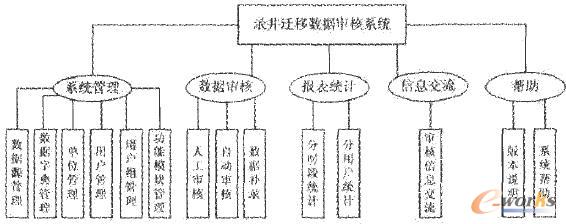 軟件功能模塊分為五大部分,系統(tǒng)管理、數(shù)據(jù)審核、報表統(tǒng)計、信息交流、系統(tǒng)幫助。系統(tǒng)管理實現(xiàn)與系統(tǒng)操作有關(guān)的數(shù)據(jù)源、數(shù)據(jù)字典、單位、用戶、用戶組、功能模塊授權(quán)等功能;數(shù)據(jù)審核部分是此系統(tǒng)的核心功能模塊,根據(jù)用戶需求,將數(shù)據(jù)審核分為人工審核、邏輯審核以及數(shù)據(jù)補錄三部分;具體的子功能模塊設(shè)計如下圖所示: