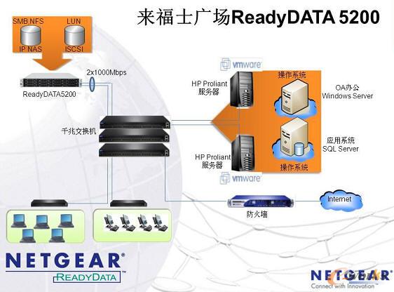 在來福士本地化的局域網(wǎng)絡(luò)中,虛擬化應(yīng)用首先必須保證OA(Windows服務(wù)器)和業(yè)務(wù)數(shù)據(jù)(SQL數(shù)據(jù)庫服務(wù)器)兩套系統(tǒng)的正常運(yùn)行,并且未來可按業(yè)務(wù)的需要隨時(shí)地增加。所以,NETGEAR基于現(xiàn)有的IP網(wǎng)絡(luò)基礎(chǔ)架構(gòu)的存儲(chǔ)ReadyDATA 5200能為虛擬化應(yīng)用提供高效的數(shù)據(jù)存儲(chǔ)。