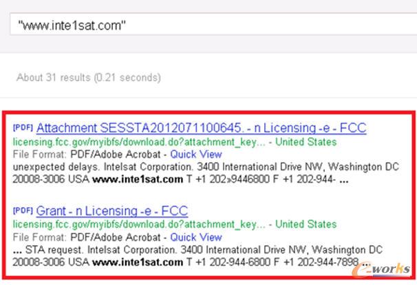 而通過谷歌搜索“inte1sat.com”,顯示的結(jié)果為一個存儲在美國聯(lián)邦通信委員會(FCC)的Web站點(diǎn)上的PDF文檔(見圖3)。 FCC是一家協(xié)調(diào)美國各州之間的無線電、電視、有線、衛(wèi)星及同軸電纜等網(wǎng)絡(luò)的大型機(jī)構(gòu),影響力甚至覆蓋到南美洲的哥倫比亞特區(qū)。