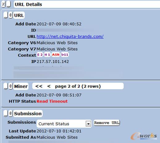 當(dāng)這個漏洞攻擊包成功執(zhí)行后,就會自動下載并運(yùn)行一個名為“IrFKDDEW.exe”的二進(jìn)制惡意軟件,并嵌入jar包中,進(jìn)而在用戶的系統(tǒng)中開啟后門。通過流量追蹤,可以發(fā)現(xiàn)該惡意軟件不斷嘗試向某IP地址發(fā)起連接請求。而其實(shí)早在2012年7月9日,這個IP地址所指向的站點(diǎn)就已經(jīng)被Websense的Virustotal鑒定為惡意站點(diǎn)(見圖5),具體報告點(diǎn)擊這里。