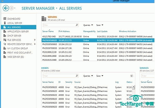服務(wù)器管理器提供一個(gè)類似于系統(tǒng)管理器的視圖,展示服務(wù)器和事件及服務(wù),雖然我們并沒有發(fā)現(xiàn)通過活動(dòng)目錄查看(比如林)的過濾方式。