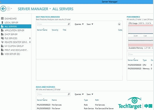 Windows Server 8中的服務(wù)器管理器結(jié)合了之前獨(dú)立的管理工具。如圖所示,角色與服務(wù)和圖形(性能)結(jié)合在一起,而最佳實(shí)踐分析器(Best Practices Analyzer)將服務(wù)器實(shí)例與最佳實(shí)踐及策略模式緊靠在一起。