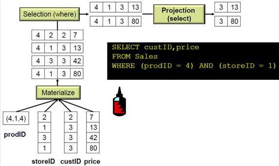 傳統(tǒng)的行式數(shù)據(jù)庫運算, 在運算的一開始就解壓縮所有數(shù)據(jù),然后執(zhí)行后面的過濾,投影,連接,聚合操作