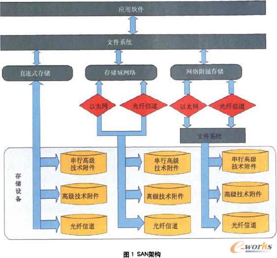 存儲區(qū)域網(wǎng)(SAN,Storage Area Network)是將存儲設(shè)備(諸如磁盤陣列、磁帶庫等)與服務(wù)器連接起來并采用光纖接口的專用存儲網(wǎng)絡(luò)。它結(jié)構(gòu)上允許服務(wù)器和任何存儲磁盤陣列或磁帶庫相連、并直接存儲所需數(shù)據(jù)。SAN架構(gòu)如圖1所示。