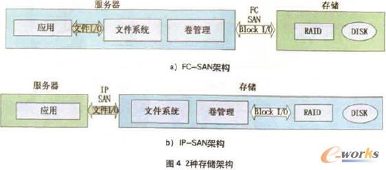 從圖4中可以看出,在FC-SAN架構(gòu)中,文件流存在于應(yīng)用系統(tǒng)和文件系統(tǒng)之間,文件系統(tǒng)和卷管理進行交互,卷管理和存儲之間進行塊傳送,存儲設(shè)備包含獨立冗余磁盤陣列(RAID)和磁盤。在IP-SAN架構(gòu)中,基本的組成元素和FC-SAN是一樣的,但是應(yīng)用系統(tǒng)和獨立于服務(wù)器之外的文件系統(tǒng)交互文件流,塊傳送因而也在存儲設(shè)備內(nèi)部發(fā)生,由此可見IP-SA N降低了服務(wù)器端的復(fù)雜度。它建立在常見和穩(wěn)定的工業(yè)標(biāo)準(zhǔn)上.對IP技術(shù)熟悉的人員可以很容易接受和實施,因而減少了聘請專業(yè)人員的成本。同時,它還減少了網(wǎng)絡(luò)數(shù)量、降低了布線復(fù)雜度,并且可以使用常規(guī)以太網(wǎng)交換機而不必專門采購光纖交換機,很大程度提高了互操作性,降低了投資。使用IP-SAN架構(gòu)使得數(shù)據(jù)傳播更為便捷,可以在全球IP網(wǎng)絡(luò)上進行以太網(wǎng)傳輸,實際傳播距離不會受到任何限制。
