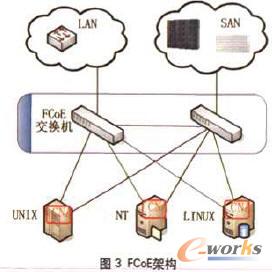 以太網(wǎng)光纖信道(FCoE)是INCITS T11開發(fā)的一項新標(biāo)準(zhǔn)。FCoE協(xié)議獨立于以太網(wǎng)轉(zhuǎn)發(fā)模式,并在以太網(wǎng)上映射本地光纖信道。FCoE保留了所有的光纖信道結(jié)構(gòu),保持與光纖信道相同的時延、安全性和流量管理特征,因此可以通過循序漸進的方法向I/O端口整合的趨勢演進。