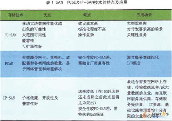 SAN、FcoE及IP-SAN 3種存儲技術(shù)的各自持點及應(yīng)用如表1所示。