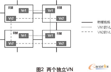 圖2是兩個(gè)獨(dú)立VN(VN1和VN2)的示意圖,圖中每個(gè)RM上有兩個(gè)不同的VR,VN1的VL和RM的物理鏈路是一致的,而VN2的VL則不同。虛擬資源和物理資源實(shí)現(xiàn)了相互邏輯獨(dú)立,虛擬網(wǎng)和底層網(wǎng)絡(luò)拓?fù)淇梢酝耆煌。VN可以根據(jù)需要調(diào)整其網(wǎng)絡(luò)拓?fù),添加或刪除虛擬節(jié)點(diǎn)。同一個(gè)RM上的不同VR之間沒(méi)有直接聯(lián)系,相互隔離,各自屬于不同VN,處于拓?fù)涞牟煌恢谩?/P>