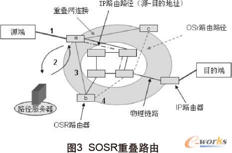 圖3描述了SOSR重疊路由的一個(gè)典型實(shí)現(xiàn)過(guò)程,圖中OSR路由器通過(guò)VR軟件模塊提供VR,這些VR處于網(wǎng)絡(luò)邊緣,能夠利用普通IP路由協(xié)議接收隧道和普通IP路由轉(zhuǎn)發(fā)的外部網(wǎng)絡(luò)的數(shù)據(jù)報(bào)文。某個(gè)源端試圖發(fā)送具有一定約束條件的數(shù)據(jù)到目的端時(shí)(圖中1),首先建立一個(gè)到OSR路由器(圖中a)的VL,然后向a發(fā)送一個(gè)信令,a收到該信令后即向路由服務(wù)器查詢(圖中2),找到符合該約束條件的能夠?qū)?bào)文轉(zhuǎn)發(fā)到目的端的中間節(jié)點(diǎn)OSR路由器(圖中b,b可以有多個(gè)),隨后a立即與b建立隧道(圖3)最后b采用傳統(tǒng)IP路由方式把報(bào)文轉(zhuǎn)發(fā)到目的端(圖4)這一過(guò)程實(shí)際上建立了兩類虛擬重疊網(wǎng)路(VN),一類傳輸信令,一類傳輸數(shù)據(jù)。這兩個(gè)VN可以采取不同的VL機(jī)制。OSR路由器在網(wǎng)絡(luò)中的位置可以是任意的,其軟件安裝簡(jiǎn)單迅速,可以快捷的進(jìn)行部署和調(diào)整。這種方式可在源端和目的端構(gòu)建多條VL,使得VN不必依賴單一VL,提高VN的可靠性。同時(shí),通過(guò)合適的中間節(jié)點(diǎn)OSR路由器選擇,也便于進(jìn)行VN流量管理和基于網(wǎng)絡(luò)邊緣的性能控制。另外,VNP提供路徑服務(wù)器可以允許快速資源發(fā)現(xiàn),這極大的便利了VL實(shí)現(xiàn)和實(shí)時(shí)調(diào)整。