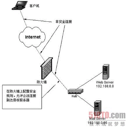 如圖1 所示,這是一般的網(wǎng)絡(luò)拓?fù)浣Y(jié)構(gòu),其中外部客戶(hù)機(jī)試圖訪(fǎng)問(wèn)內(nèi)網(wǎng)服務(wù)器時(shí),其訪(fǎng)問(wèn)連接通過(guò)Internet 到達(dá)防火墻,經(jīng)過(guò)其安全認(rèn)證后,即可穿越防火墻訪(fǎng)問(wèn)內(nèi)網(wǎng)中的目標(biāo)服務(wù)器。在數(shù)據(jù)傳輸過(guò)程中,數(shù)據(jù)沒(méi)有經(jīng)過(guò)任何加密處理,其安全性實(shí)際上是比較低的。