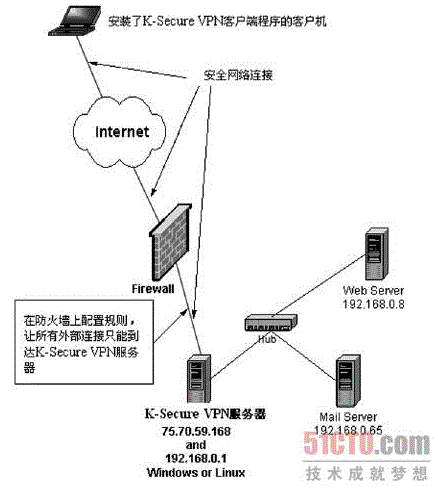 在內(nèi)網(wǎng)指定主機(jī)上( 假設(shè)為“Server1”) 安裝KSecureVPN 服務(wù)器端程序。該機(jī)處于網(wǎng)絡(luò)最前沿,隱藏在防火墻之后,內(nèi)網(wǎng)所有主機(jī)都連接在該機(jī)上,外部數(shù)據(jù)必須由防火墻送達(dá)該機(jī),經(jīng)其統(tǒng)一處理后才允許發(fā)送給目標(biāo)主機(jī)。