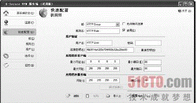 K-Secure VPN 是通過(guò)規(guī)則控制網(wǎng)絡(luò)連接的,在窗口左側(cè)單擊“快速配置”按鈕,在右側(cè)窗口(如圖4 所示)的“組”欄中輸入或者選擇規(guī)則組的名稱(chēng)(如“HTTP Group”),在“規(guī)則名”欄中輸入規(guī)則的名稱(chēng)(如“Http Rule”)。選擇“啟用”項(xiàng),表示激活本規(guī)則。在“用戶(hù)名”欄中輸入用戶(hù)名稱(chēng)(如“HTTP User”),只有指定的用戶(hù)才可以使用該規(guī)則。