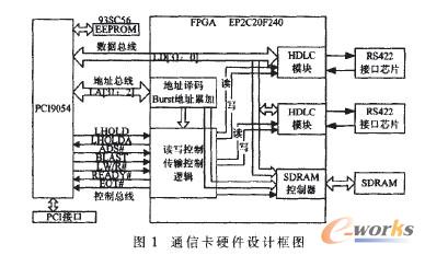 通信卡主要采用PCI9054和FPGA構(gòu)成硬件系統(tǒng),其硬件結(jié)構(gòu)圖如圖1所示。數(shù)據(jù)傳輸流程為:接收數(shù)據(jù)時,通過RS一422接口芯片接收數(shù)據(jù),數(shù)據(jù)格式滿足簡化的HDLC協(xié)議;通過FPGA內(nèi)部的HDI.C模塊進(jìn)行數(shù)據(jù)接收和串并轉(zhuǎn)換;然后在本地控制邏輯的控制下通過PCI9054以DMA方式傳給上位機(jī),實(shí)現(xiàn)數(shù)據(jù)的接收和判讀;發(fā)送數(shù)據(jù)時,上位機(jī)軟件將數(shù)據(jù)以DMA方式傳給PCI9054再輸入FPGA,在其內(nèi)部HDLC模塊的作用下,進(jìn)行數(shù)據(jù)并串轉(zhuǎn)換和HDLC協(xié)議轉(zhuǎn)換,最后通過RS一422發(fā)送器進(jìn)行電平轉(zhuǎn)換和數(shù)據(jù)發(fā)送。預(yù)留SDRAM以滿足大容量數(shù)據(jù)通信需要。
