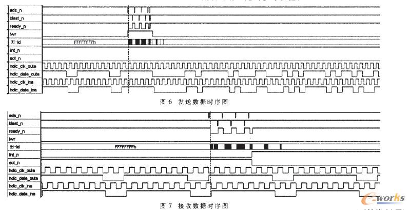 圖6、圖7分別給出了利用Quartus II的在線邏輯分析儀SignalTap II獲取的PCI寫數(shù)據(jù)、HDLC數(shù)據(jù)發(fā)送和HDLC接收、PCI讀數(shù)據(jù)的時序波形圖。從圖中可以看到,HDLC模塊正確實(shí)現(xiàn)了插“O”和去“0”操作,并能與PCI9054進(jìn)行正確的數(shù)據(jù)收發(fā)。