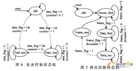 發(fā)送控制狀態(tài)機(jī)和接收控制狀態(tài)機(jī)分別如圖4、圖5所示。發(fā)送數(shù)據(jù)時,發(fā)送狀態(tài)機(jī)首先判斷寫FIFO是否有數(shù)據(jù),若有數(shù)據(jù),則插入幀頭,依次讀取FIFO數(shù)據(jù),完成插“0”操作和插幀尾操作,并按照從低到高的順序發(fā)送數(shù)據(jù),直至寫FIFO為空。接收數(shù)據(jù)時,首先搜索幀頭,為了防止接收到連續(xù)兩個標(biāo)志字而把后一個標(biāo)志字誤認(rèn)為是數(shù)據(jù),設(shè)置搜索數(shù)據(jù)狀態(tài)(Data_find),若不是標(biāo)志字,則作為數(shù)據(jù)進(jìn)行去“0”操作,完成串并轉(zhuǎn)換和幀尾檢測,并將接收到的數(shù)據(jù)以32 bit為單位,逐次寫入讀FIFO中。當(dāng)一幀傳輸結(jié)束,采用中斷信號通知上位機(jī)及時讀取數(shù)據(jù)。一旦檢測到丟棄序列(0x7F),則結(jié)束對此幀數(shù)據(jù)的處理,并清空讀FIFO里的數(shù)據(jù),同時上報(bào)PC機(jī)錯誤信息,請求發(fā)送方重新發(fā)送數(shù)據(jù)。