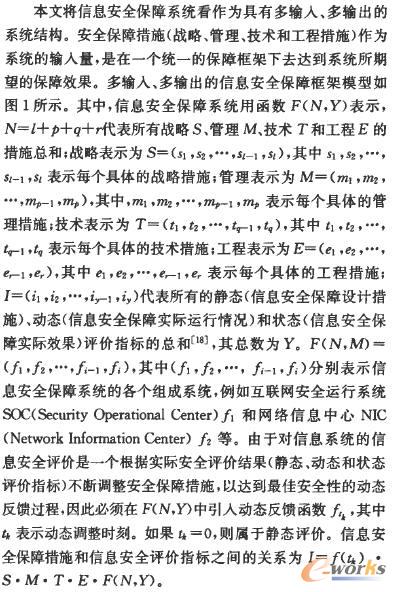 依據(jù)上述對保障模型的分析,可以看出保障措施和保障效果的好壞存在因果關(guān)系,即保障措施是因,保障效果是果。保障措施越不力,保障效果就越差,發(fā)生安全事件的可能性就越大,反之也成立。但是安全事件的發(fā)生除了與保障措施設(shè)置不當有關(guān)以外,在很大程度上受到偶然性的影響。因而,評價保障措施指標從而預測保障效果和實際運行效果之間存在一定程度的相關(guān)關(guān)系,它們從不同側(cè)面、不同階段反映了系統(tǒng)整體的安全保障水平,二者互為補充。這兩種指標結(jié)合,既考查了系統(tǒng)在一定時期內(nèi)實際安全保障成績,又考查了系統(tǒng)要素及其組合中因措施不力而造成的安全隱患,避免了評價過程的片面性,能夠比較全面而客觀地反映信息保障的整體安全態(tài)勢。