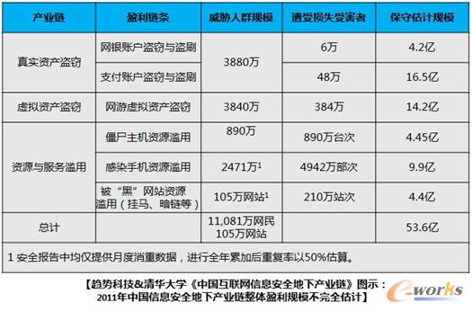 隨著中國互聯(lián)網的快速發(fā)展,中國互聯(lián)網網民在上網期間則頻繁地遭遇到安全威脅。報告對中國互聯(lián)網信息安全地下產業(yè)鏈進行了一次廣泛且深入的結構性調查與實證數(shù)據(jù)分析,全面揭示了中國地下產業(yè)鏈的當前情況、內部特征以及發(fā)展趨勢。據(jù)報告顯示:在2011年,由中國互聯(lián)網信息安全地下產業(yè)鏈的總體贏利規(guī)模已超過50億元人民幣,監(jiān)測到地下黑市參與者超過9萬人。