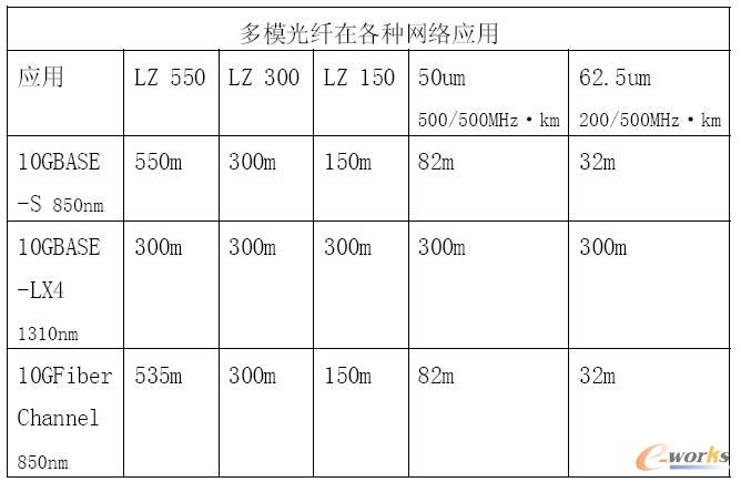 從表中可以看出在10GBASE-LX4 的通訊規(guī)格下,使用LZ 型光纖與50um/62.5um 多模光纖的傳輸距離都為300m,但LZ 型光纖色散率低,零色散率為0.101ps/nm·km,因此不需要加光纖衰減補償裝置,可降低網(wǎng)絡布線成本。