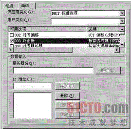 首先,切換進入DHCP 服務器的控制界面,展開該界面左側子窗格中的目標主機選項,右擊“作用域選項”,選擇右鍵菜單中的“配置選項”命令,繼續(xù)選擇彈出界面中的“高級”選項卡,打開高級選項設置頁面,如圖2所示。