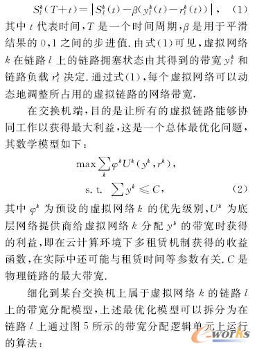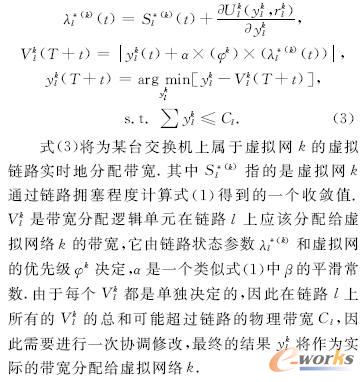 其中t代表時(shí)間,T是一個(gè)時(shí)間周期,口是用于平滑結(jié)果的O,1之間的步迸值。由式(1)可見,虛擬網(wǎng)絡(luò)k在鏈路l上的鏈路擁塞狀態(tài)由其得到的帶寬ykl和鏈路負(fù)載rkl決定。通過式(1),每個(gè)虛擬網(wǎng)絡(luò)可以動(dòng)態(tài)地調(diào)整所占用的虛擬鏈路的網(wǎng)絡(luò)帶寬。