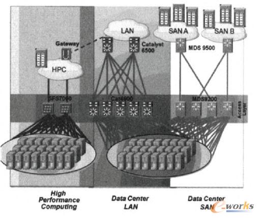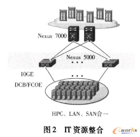 要形成云計(jì)算的資源池,必須使所有IT資源共享化,這就是資源的整合化。使用統(tǒng)一交換技術(shù),將傳統(tǒng)數(shù)據(jù)中心存在的三種網(wǎng)絡(luò)(使用光纖存儲(chǔ)交換機(jī)的存儲(chǔ)交換網(wǎng)絡(luò)即Fiber Channel SAN,便于實(shí)現(xiàn)CPU、內(nèi)存資源并行化處理的高性能計(jì)算網(wǎng)絡(luò)即多采用高帶寬低延遲的InfiniBand技術(shù),以及傳統(tǒng)的數(shù)據(jù)以太網(wǎng)技術(shù))形成的資源豎井打破,使用Fiber Channel Over Ethemet(FCoE)標(biāo)準(zhǔn)協(xié)議構(gòu)建統(tǒng)一的IT資源統(tǒng)一交換如圖2所示。