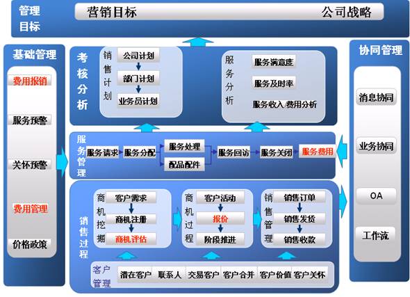 - 本方案的核心設(shè)計思想是:在接單前以客戶管理、商機(jī)管理為核心,全面挖掘與分析客戶需求,提升贏單率;接單時通過全面銷售訂單評估,保證利潤最大化;在簽單后通過高效的協(xié)同供應(yīng)鏈對訂單進(jìn)行全面跟蹤與控制,保障按期交付;在產(chǎn)品交付后通過對服務(wù)的全程處理與分析,提高客戶滿意度和忠誠度。