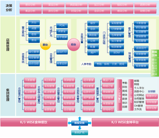 金蝶K/3 RISE ERP食神餐飲連鎖版:金蝶 K/3 WISE酒樓連鎖行業(yè)管理解決方案針對當前餐飲酒樓連鎖企業(yè)運營的需求,通過建設分店的信息管理系統(tǒng)解決店面的運營問題,通過集團會員管理模塊、集團中央配送模塊、集團營業(yè)管理模塊解決企業(yè)的會員、配送和門店營業(yè)的遠程集中管控,通過數(shù)據(jù)交換平臺實現(xiàn)分店和總部之間的數(shù)據(jù)交換,為企業(yè)提供有效、準確、及時的業(yè)務分析數(shù)據(jù),從而保證企業(yè)做出準確的經(jīng)營決策