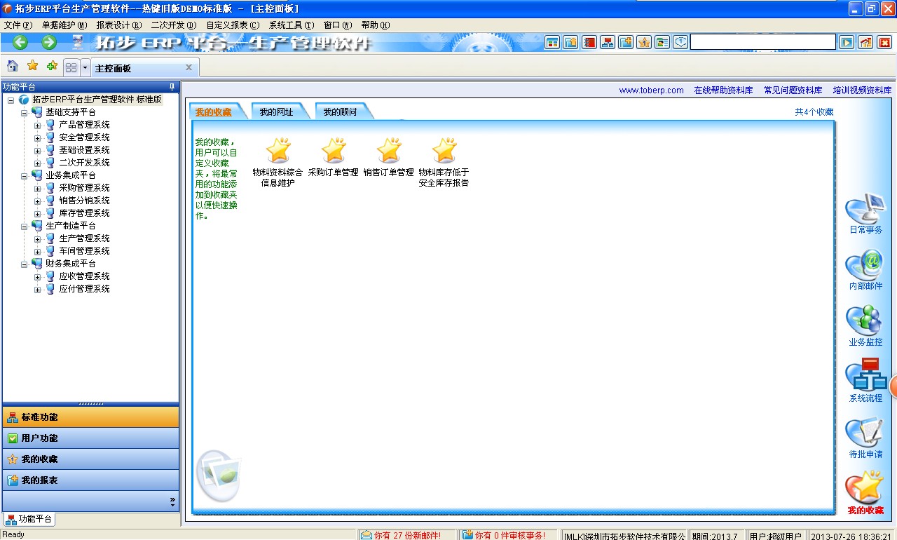 拓步ERP生產(chǎn)系列標準版--進銷存生產(chǎn)管理軟件包括拓步ERP平臺的產(chǎn)品管理系統(tǒng)、安全管理系統(tǒng)、基礎設置系統(tǒng)、二次開發(fā)系統(tǒng)、銷售管理系統(tǒng)、采購管理系統(tǒng)與庫存管理系統(tǒng),生產(chǎn)管理系統(tǒng)、車間管理系統(tǒng),以及應收帳款系統(tǒng)與應付帳款系統(tǒng)等。