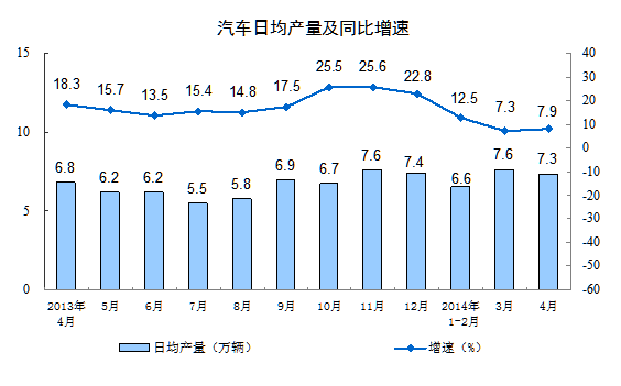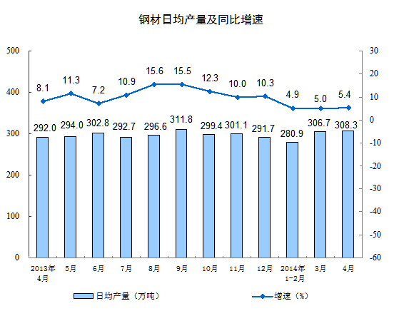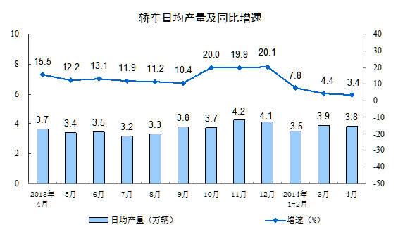 分產(chǎn)品看,4月份,多種產(chǎn)品同比增長。其中,鋼材9250萬噸,增長5.4%;水泥22589萬噸,增長3.9%;十種有色金屬340萬噸,增長4.3%;乙烯134萬噸,增長6.7%;汽車220.4萬輛,增長7.9%;轎車114.7萬輛,增長3.4%;發(fā)電量4250億千瓦時(shí),增長4.4%(新浪財(cái)經(jīng)注:增速創(chuàng)十個(gè)月來新低);原油加工量3958萬噸,增長3.8%。