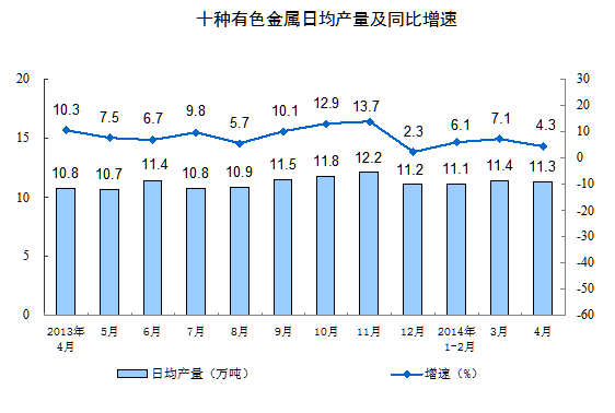 圖為十種有色金屬日均產(chǎn)量及同比增速