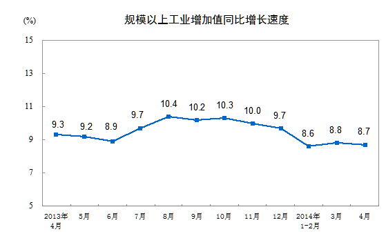2014年4月份,規(guī)模以上工業(yè)增加值同比實(shí)際增長8.7%(以下增加值增速均為扣除價(jià)格因素的實(shí)際增長率),比3月份回落0.1個(gè)百分點(diǎn)。從環(huán)比看,4月份比上月增長0.82%。1-4月份,規(guī)模以上工業(yè)增加值同比增長8.7%。