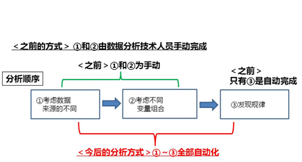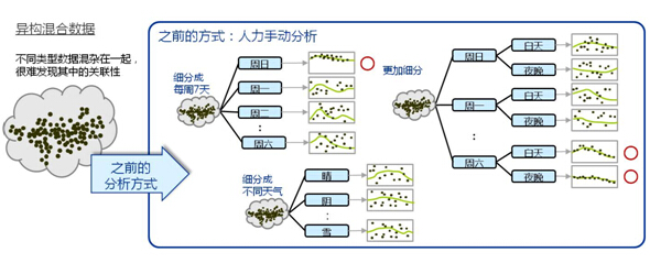 以往“依條件篩選數(shù)據(jù)”與“多項(xiàng)變量的組合”,都必須依靠具備專業(yè)知識(shí)的分析人員手動(dòng)操作。例如,在進(jìn)行零售業(yè)的銷售預(yù)測(cè)時(shí),統(tǒng)計(jì)分析不同門店的銷售趨勢(shì)后,以一星期7天、不同天氣等條件為分析基礎(chǔ),都必須由分析人員反復(fù)依靠條件篩選數(shù)據(jù)。此外,對(duì)于某一商品而言,重要的變量分析組合,可能為不同種類的商品銷售帶來哪些影響,在調(diào)查此類情形時(shí),分析人員也必須事先針對(duì)各項(xiàng)商品提出假設(shè),而后進(jìn)行評(píng)價(jià)。