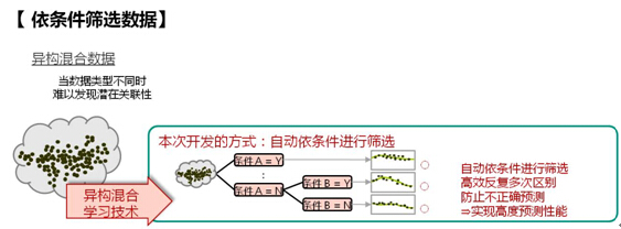 “異構(gòu)混合學(xué)習(xí)技術(shù)”能夠發(fā)現(xiàn)混合存在于大數(shù)據(jù)中的多個(gè)關(guān)聯(lián)性,同時(shí)將所發(fā)現(xiàn)的關(guān)聯(lián)性分解為多個(gè)簡(jiǎn)單式,并針對(duì)分析目標(biāo),組合相關(guān)變量后進(jìn)行分析,實(shí)現(xiàn)高度預(yù)測(cè)與判斷。