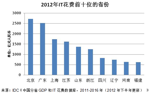 根據(jù)IDC《中國(guó)分省GDP和IT花費(fèi)數(shù)據(jù)庫(kù),2011-2016年(2012年下半年更新)》(文檔號(hào) #CN8037331U),中國(guó)總體IT花費(fèi)在2012年仍保持較高增速,但是2013年其增長(zhǎng)速度將出現(xiàn)回落。目前,中國(guó)的IT花費(fèi)仍然集中在少數(shù)省份,但是中等發(fā)達(dá)省份的IT市場(chǎng)正在加速發(fā)展,其增速已經(jīng)明顯超越了傳統(tǒng)意義上的IT花費(fèi)大省。