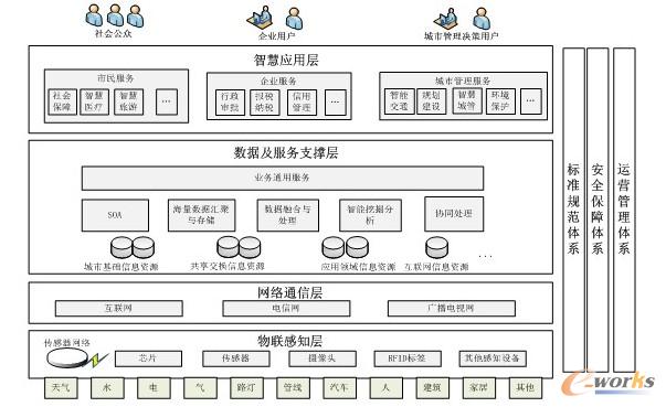 本次會議初步提出了智慧城市基礎參考模型和智慧城市標準體系。其中,智慧城市基礎參考模型(如圖1示)主要分為物聯(lián)感知層、網(wǎng)絡通信層、數(shù)據(jù)及服務支撐層及智慧應用層。智慧城市標準體系(如圖2示)包括智慧城市總體標準、智慧城市技術支撐與軟件標準、智慧城市運營及管理標準、智慧城市安全標準、智慧城市安全標準、智慧城市應用標準由五個類別的標準組成。后續(xù),SOA分委會將組織更多成員單位編寫《我國智慧城市標準體系研究報告》。