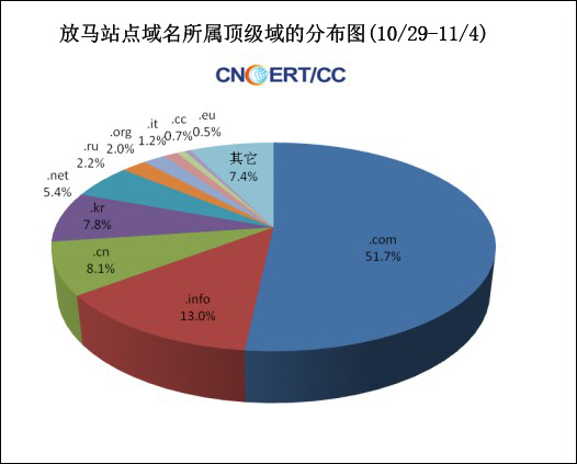 (3)在網(wǎng)絡(luò)病毒傳播上,CNCERT 監(jiān)測(cè)發(fā)現(xiàn)的放馬站點(diǎn)中,通過域名訪問的共涉及有408個(gè),通過IP直接訪問的共涉及有161個(gè)。在408個(gè)放馬站點(diǎn)域名中,于境內(nèi)注冊(cè)的域名數(shù)為75個(gè)(約占18.4%),于境外注冊(cè)的域名數(shù)為287個(gè)(約占70.3%),未知注冊(cè)商所屬境內(nèi)外信息的有46個(gè)(約占11.3%)。下圖為這些放馬站點(diǎn)域名按所屬頂級(jí)域的分布情況,排名前三位的是.com(約占51.7%)、.info(約占13%)、.cn(約占8.1%)。
