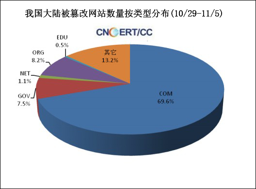 根據(jù)CNCERT監(jiān)測(cè)數(shù)據(jù),在統(tǒng)計(jì)期間,境內(nèi)被篡改網(wǎng)站數(shù)量為1017個(gè),較上周環(huán)比減少了10.2%。境內(nèi)被篡改網(wǎng)站數(shù)量按類型分布情況如下圖所示,數(shù)量最多的仍是COM類網(wǎng)站。其中,GOV類網(wǎng)站有76個(gè)(約占境內(nèi)7.5%),與上周數(shù)量相等。