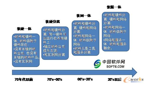 曹開彬認(rèn)為,縱觀軟件產(chǎn)業(yè)的發(fā)展,軟件會經(jīng)歷四次變異,即軟硬一體、軟硬分離、軟網(wǎng)一體,和軟服一體。