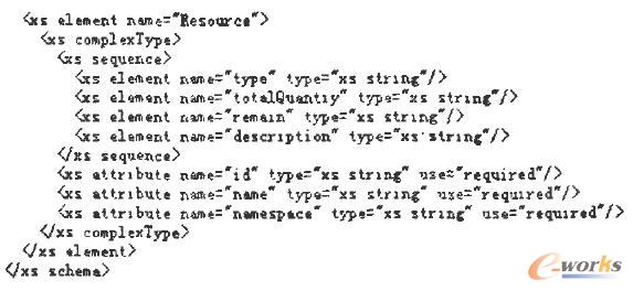 通過以上的模型就可以在生產(chǎn)車間原有的信息系統(tǒng)之上,獲取生產(chǎn)過程和資源進行服務和資源建模,把服務依賴的資源進行等級評判,通過SOA的XML描述方法對原有的系統(tǒng)進行功能擴展。XML描述通過制定的Schema文件即可獲取需要的資源和服務,并且發(fā)布該信息,圖2和圖3分別為資源和服務的Schema文件。對資源和服務的描述中使用資源統(tǒng)一標識符(UUID)進行標示,實現(xiàn)服務和資源的統(tǒng)一管理,為后續(xù)的資源和服務調(diào)用提供基礎平臺。