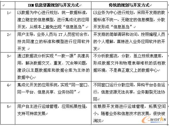 通過上表五個(gè)方面的比較,我們深刻認(rèn)識(shí)到什么是信息化建設(shè)的基礎(chǔ)工作。傳統(tǒng)的、習(xí)慣的應(yīng)用開發(fā),主要是依賴開發(fā)商的IT人員,他們雖然熟悉信息技術(shù),但對(duì)業(yè)務(wù)的理解膚淺,他們進(jìn)行的應(yīng)用開發(fā)往往與用戶的信息化發(fā)展戰(zhàn)略規(guī)劃脫節(jié),不會(huì)真正把握用戶需求,在沒做好基礎(chǔ)工作的情況下就著手建數(shù)據(jù)庫(kù)、編應(yīng)用軟件。這樣的應(yīng)用開發(fā),當(dāng)然避免不了產(chǎn)生信息孤島、不能發(fā)揮信息化投資綜合效益的厄運(yùn)。以信息工程方法論為指導(dǎo)信息化建設(shè)基礎(chǔ)工作,就是要加強(qiáng)組織領(lǐng)導(dǎo),組建兩類人員密切合作的規(guī)劃隊(duì)伍,發(fā)揮咨詢顧問的作用,做好信息資源規(guī)劃,為構(gòu)建信息化大廈奠定堅(jiān)實(shí)的基礎(chǔ)。