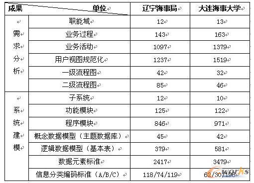 遼寧海事局是為建立全局?jǐn)?shù)據(jù)中心和統(tǒng)一的信息平臺(tái)而進(jìn)行信息資源規(guī)劃的,大連海事大學(xué)是為建立綜合校務(wù)管理信息系統(tǒng)而進(jìn)行信息資源規(guī)劃的,兩單位信息資源規(guī)劃的主要成果統(tǒng)計(jì)如表2所示。