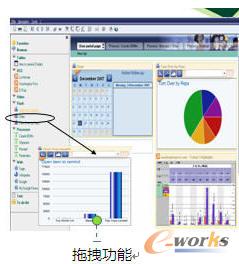 1、第一個(gè)特色是提高企業(yè)的洞察力。這主要是給企業(yè)的高層領(lǐng)導(dǎo)來使用的,它有一個(gè)很好的工具,叫做企業(yè)門戶,即能讓每個(gè)用戶看到一個(gè)不同的首頁。它的管理方式非常簡單,可以通過鼠標(biāo)的拖拽,重新設(shè)計(jì)這個(gè)企業(yè)的門戶。這里面選擇的內(nèi)容包括日歷、圖表、餅狀圖、柱狀圖、儀表盤,同時(shí)一旦業(yè)務(wù)有些異常情況發(fā)生,還會有一些預(yù)警。