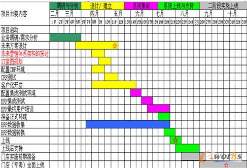 為保證項(xiàng)目按計(jì)劃進(jìn)度進(jìn)行,對(duì)于每個(gè)階段都有詳細(xì)的工作計(jì)劃,培訓(xùn)工作貫穿整個(gè)實(shí)施過(guò)程。從項(xiàng)目開(kāi)始,項(xiàng)目咨詢(xún)?nèi)藛T同領(lǐng)導(dǎo)層進(jìn)行深入的交流,使其了解系統(tǒng)實(shí)施的風(fēng)險(xiǎn)、項(xiàng)目的本質(zhì)及實(shí)施全過(guò)程。項(xiàng)目啟動(dòng)后,公司建立以董事長(zhǎng)掛帥的項(xiàng)目指導(dǎo)委員會(huì)主要負(fù)責(zé)把握總體工作方向及重大問(wèn)題決策,協(xié)調(diào)并解決管理信息系統(tǒng)項(xiàng)目中的重大問(wèn)題;在不影響公司正常業(yè)務(wù)的情況下,從部門(mén)抽調(diào)精兵強(qiáng)將60余人與IBM顧問(wèn)團(tuán)隊(duì)建立聯(lián)合ERP項(xiàng)目組,下設(shè)項(xiàng)目秘書(shū)組、制造組、分銷(xiāo)組、財(cái)務(wù)組、技術(shù)組。整個(gè)項(xiàng)目團(tuán)隊(duì)將在項(xiàng)目指導(dǎo)委員會(huì)領(lǐng)導(dǎo)成員及項(xiàng)目推進(jìn)領(lǐng)導(dǎo)小組成員的領(lǐng)導(dǎo)下展開(kāi)所有的項(xiàng)目活動(dòng),新光飾品項(xiàng)目組成員在整個(gè)項(xiàng)目實(shí)施過(guò)程中全程參與項(xiàng)目實(shí)施。