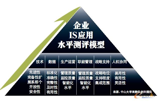 第二種是IT應(yīng)用的水平評(píng)價(jià)。這種評(píng)價(jià)可以避免結(jié)果的滯后性和多因果導(dǎo)致的評(píng)估困難。中山大學(xué)謝康教授提出了IT應(yīng)用水平評(píng)價(jià)體系,構(gòu)建了企業(yè)IS應(yīng)用水平測(cè)評(píng)模型,包括戰(zhàn)略、運(yùn)作和基礎(chǔ)三個(gè)層面,技術(shù)質(zhì)量、數(shù)據(jù)質(zhì)量、業(yè)務(wù)運(yùn)營(yíng)、職能管理、人機(jī)協(xié)同和戰(zhàn)略支持6個(gè)維度,22個(gè)指標(biāo),對(duì)企業(yè)IT應(yīng)用水平進(jìn)行評(píng)價(jià)。