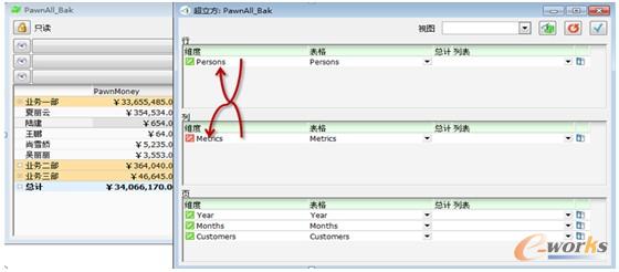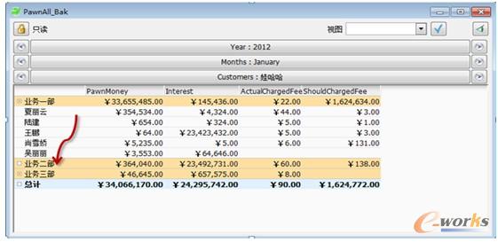 ⑨ 對(duì)典當(dāng)金額排名,季度金額占比,客戶的關(guān)系等,在客戶金額占比上進(jìn)行鉆取,明列出詳細(xì)的Cube數(shù)據(jù),可進(jìn)行維度調(diào)整,在B/S模式上,也可進(jìn)行用戶自定義圖表: